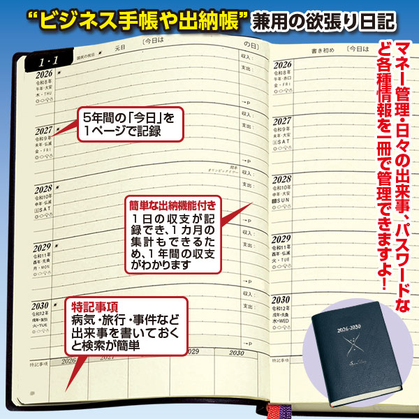 5年間の「今日」を1ページで記録。“ビジネス手帳や出納帳”兼用の欲張り日記です。