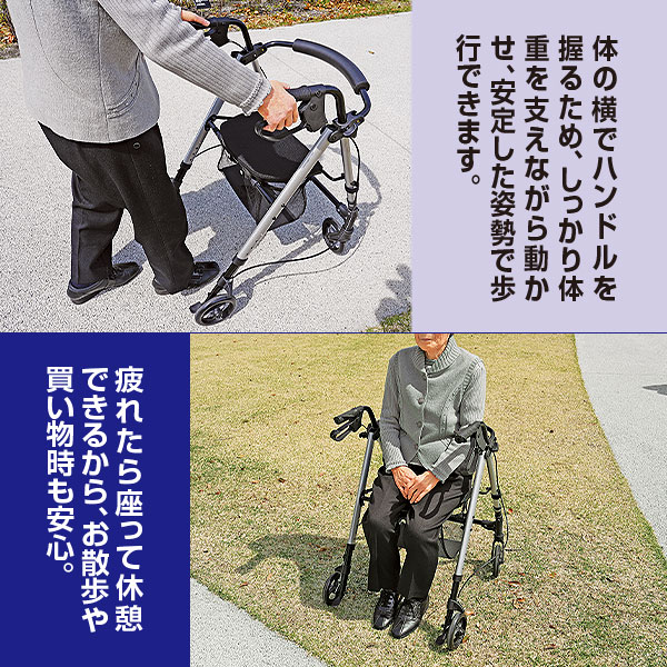 体の横でハンドルを握るため、しっかり体重を支えながら動かせ、安定した姿勢で歩行できます。