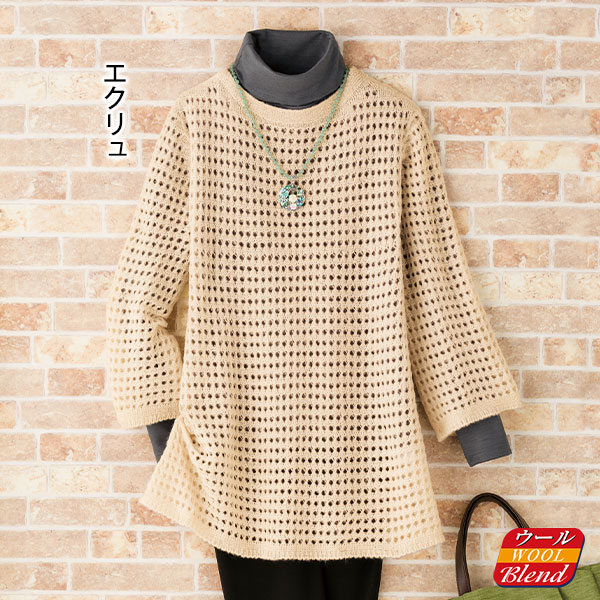 やさしい肌ざわりの素材感をもつ、透かし編みのチュニックセーターです。