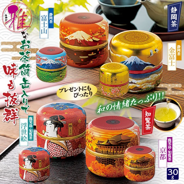 日本情緒たっぷりな富士山、浮世絵、京都のお寺を描いた茶筒に入ったお茶缶です。