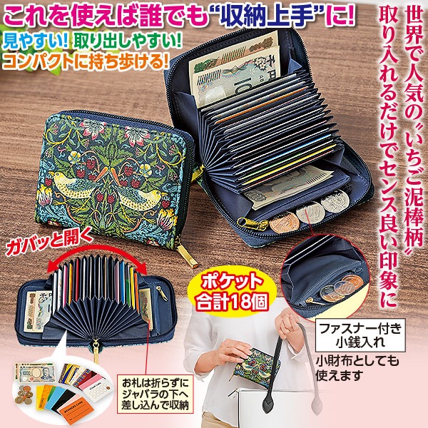 ■仕様/開閉ファスナー式、ジャバラ式カードポケット×15、広めカードポケット×2、ファスナー付きポケット×1