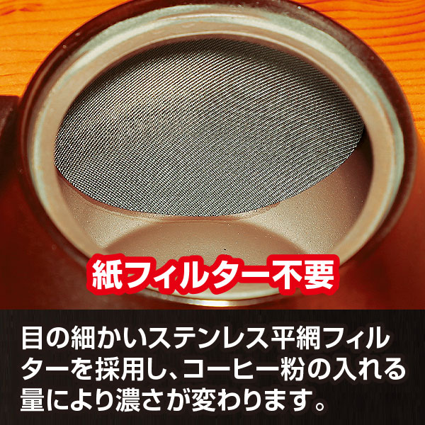 目の細かいステンレス平網フィルターを採用し、お湯を注いで浸す時間でお好みの濃さを調節できます。
